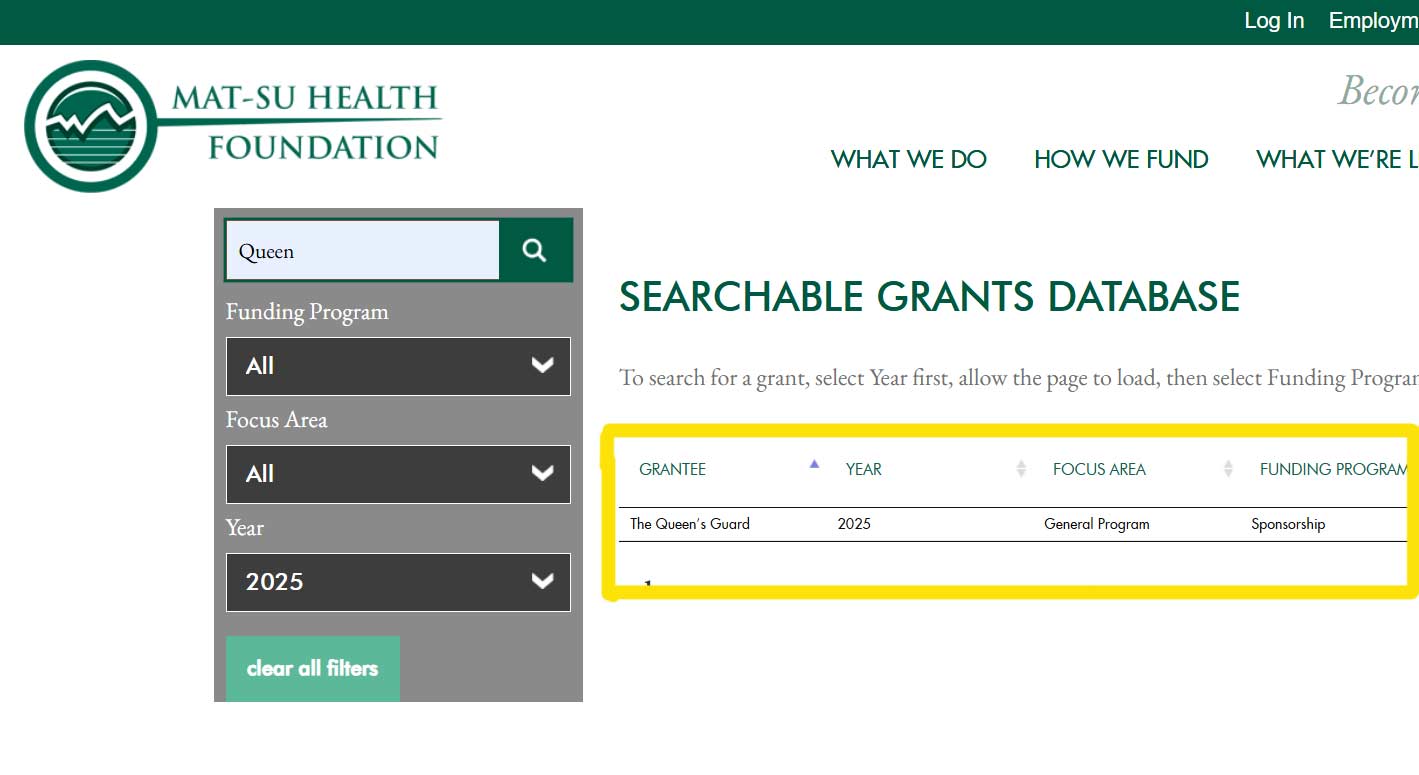 Shirley–The Queen’s Guard is a 501(c)(3) non-profit organization. As such, it is eligible for grants from the Mat-Su Health Foundation. It does not need anyone’s approval in order to open an office in Palmer, and it does not require community approval to receive grants.