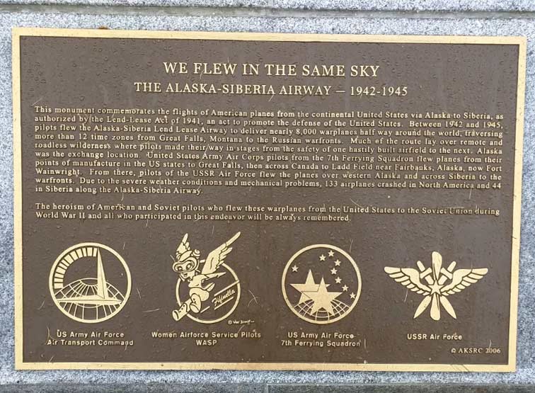 Alaska served as the exchange location for transferring the planes to the Soviet Union. United States Army Air Corps pilots from the 7th Ferrying Group and Women Airforce Service Pilots (WASPs) flew combat planes from their points of manufacture in the U.S. to Great Falls, Montana, where male pilots of the 7th Ferrying Group flew them across Canada to Ladd Army Airfield, now Fort Wainwright, near Fairbanks, Alaska. From there, pilots of the USSR’s Air Force flew the planes over western Alaska and across Siberia to the warfronts.