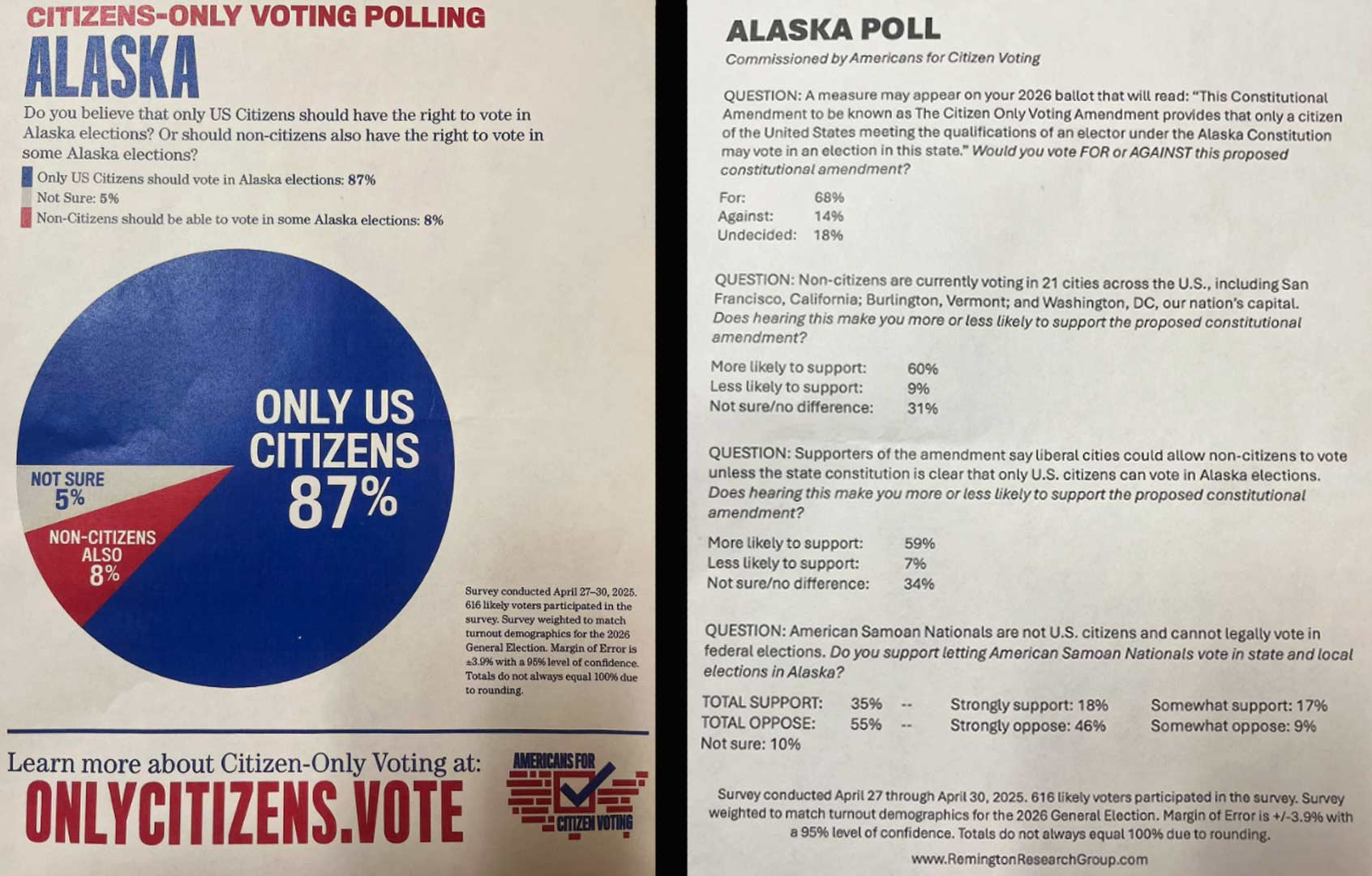 Conducted April 27-30, the poll asked 616 likely voters the following question: “Do you believe that only U.S. Citizens should have the right to vote in Alaska elections? Or should non-citizens also have the right to vote in some Alaska elections?”