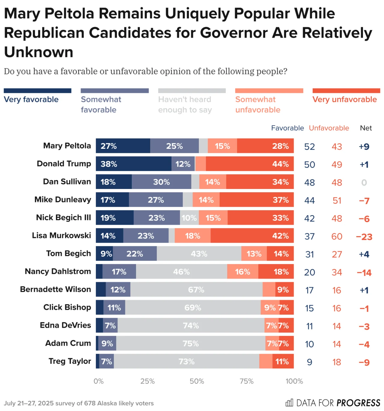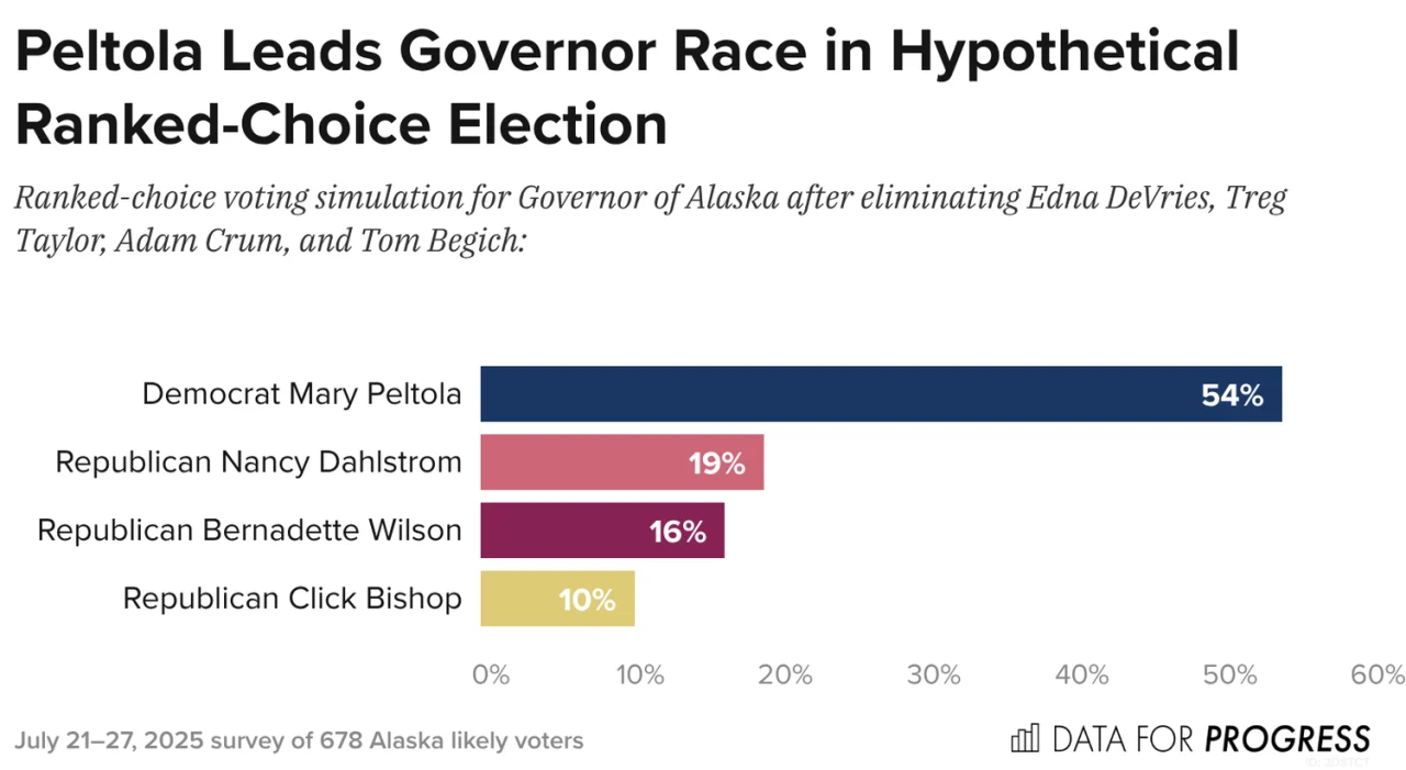 Newly released Data for Progress polling shows former Alaska Congresswoman Mary Peltola with the highest favorability among Alaska’s top candidates in a hypothetical ranked-choice election for governor.