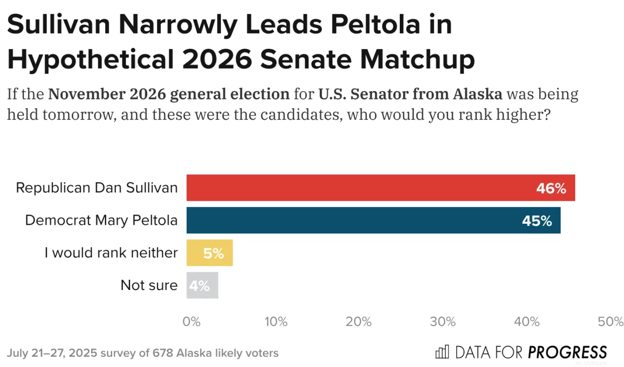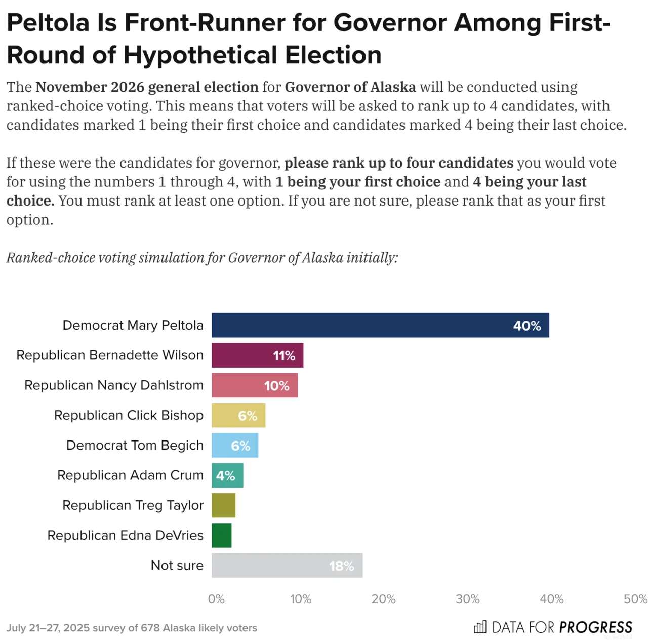 From July 21 to 27, 2025, Data for Progress conducted a survey of 678 likely voters in Alaska using SMS and web panel respondents. The sample was weighted to be representative of likely voters by age, gender, education, race, geography, and recalled vote. The margin of error associated with the sample size is ±4 percentage points.