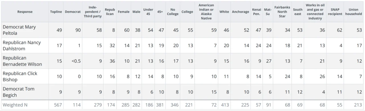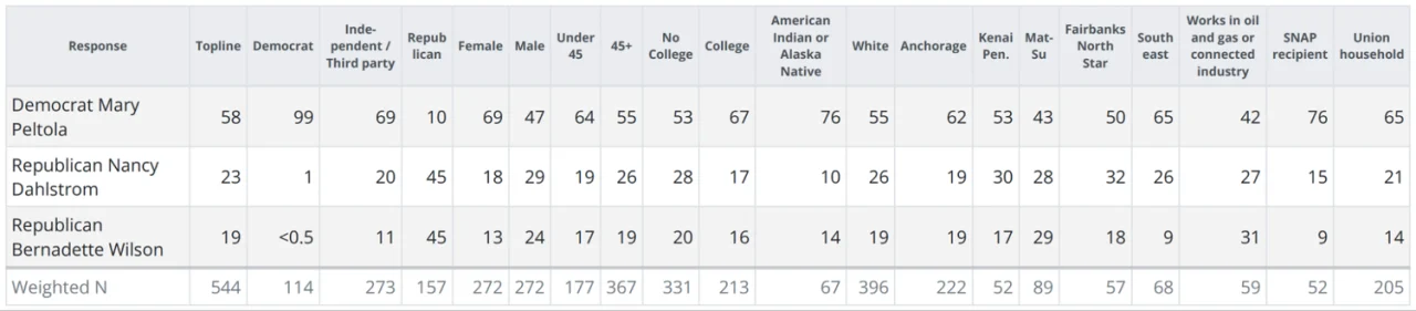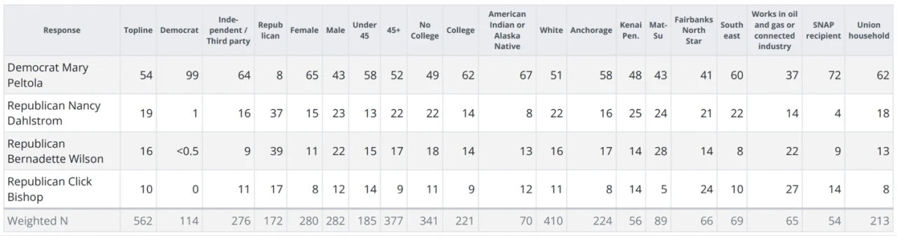 Were Peltola to enter the race for governor, however, the poll indicates she would be the top candidate.