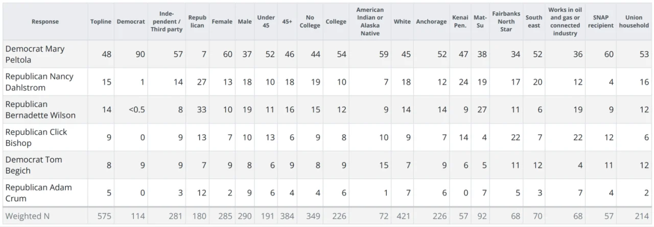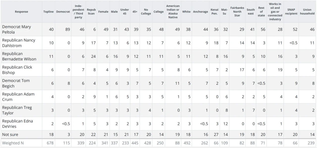 So a progressive pollster polling Democrats. LOL Of course the loser Peltola would win. The only way she can win is the way she won last time, RCV. Hopefully everyone has wised up and will only select one candidate thereby eliminating any votes for Mrs. Do Nothing.