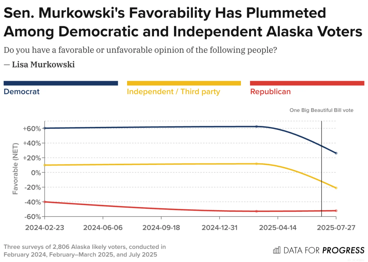 While Republican voter sentiment is mostly unchanged, Democratic and Independent voters view Murkowski much worse now, dropping from +63 to +26 among Democrats and falling from +12 to -21 among Independents.