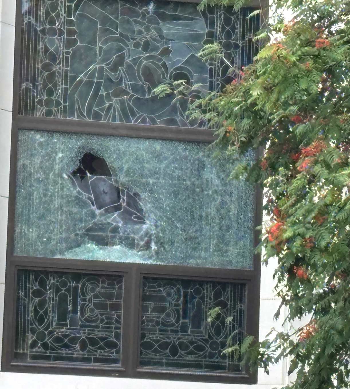 “It is with much sorrow that I inform you that the Church and Ministry Center were vandalized early this morning,” Father James Moore said in an email to Holy Family Old Cathedral parishioners. “A single individual broke a stained glass window, the 5th Ave. side sacristy window, and two windows at St. Paul’s.”
