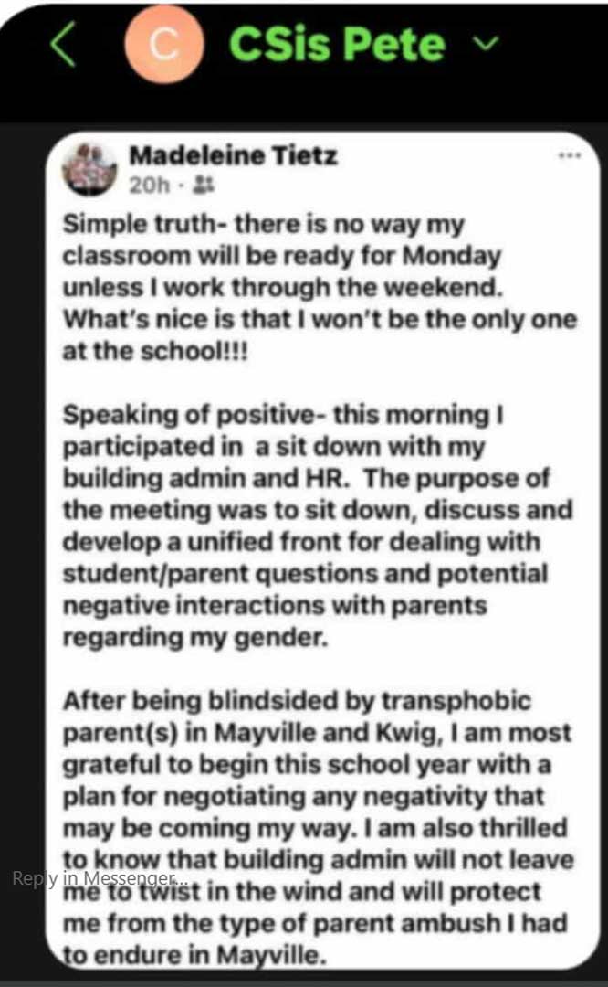 “The purpose of the meeting was to sit down, discuss and develop a unified front for dealing with student/parent questions and potential negative interactions with parents regarding my gender,” Tietz posted to one of his social media accounts. “After being blindsided by transphobic parents(s) in Mayville and Kwig [Kwigillingok], I am most grateful to begin this school year with a plan for negotiating any negativity that may be coming my way. I am also thrilled to know that building admin will not leave me to twist in the wind and will protect me from the type of parent ambush I had to endure in Mayville.”