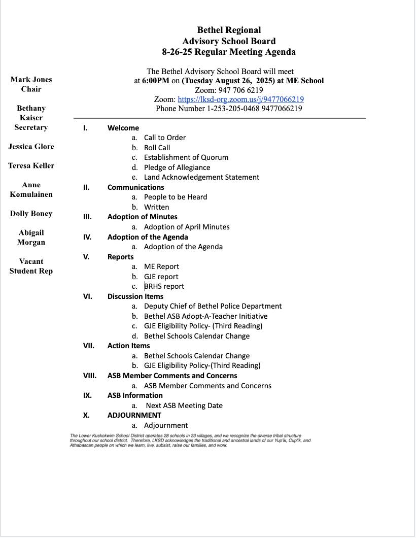 Set to begin at 6 p.m. on Aug. 26, a regularly scheduled Bethel Regional Advisory School Board meeting will occur at Mikelnguut Elitnaurviat Elementary School. The gathering includes a public comment period that will begin immediately after being called to order.