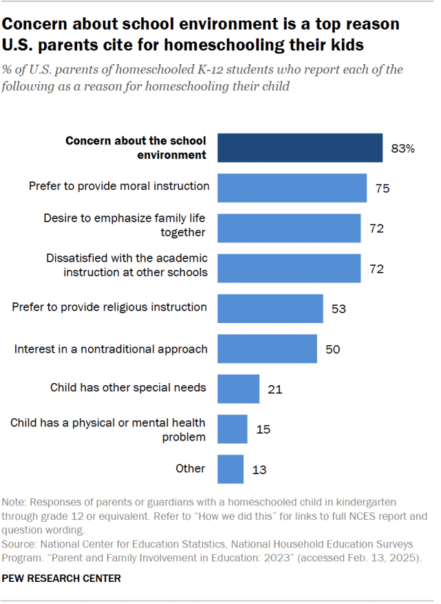 According to a 2025 Pew Research Center study homeschooling parents cite multiple factors for choosing to home educate. The most common reason is concern about the school environment – such as safety, drugs or negative peer pressure (83% of parents of homeschooled children cite this as a reason).