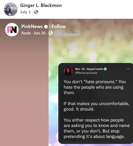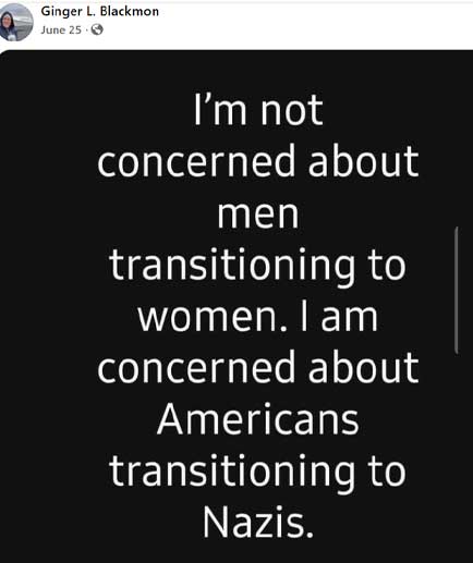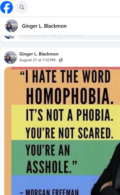 When she isn’t railing against the MAGA movement, Blackmon’s Facebook page condemns anyone who would question the hard-leftist ideology of the LGBTQ agenda, calling them dangerous haters, bigots and a**holes.