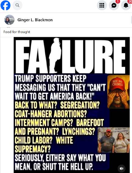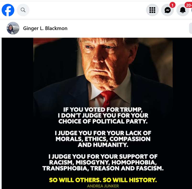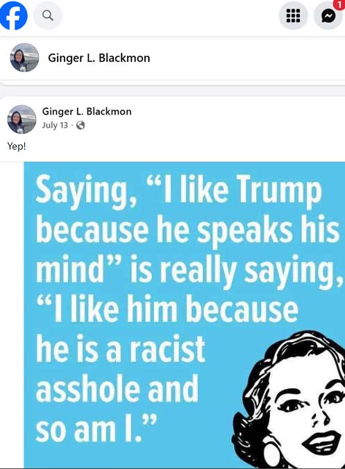 Blackmon’s posts include allegations that Trump voters are in favor of “racism, misogyny, homophobia, transphobia, treason and fascism.” Interesting, seems to me that most of the replies here are angry because she is not in favor of these things.