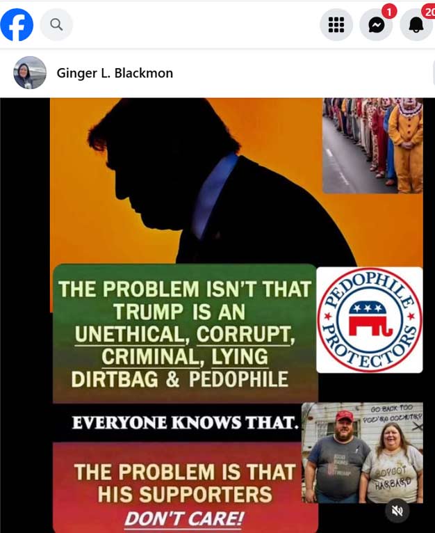 One post states: “The problem isn’t that Trump is an unethical, corrupt, criminal, lying dirtbag and pedophile. Everyone knows that. The problem is that his supporters don’t care.”