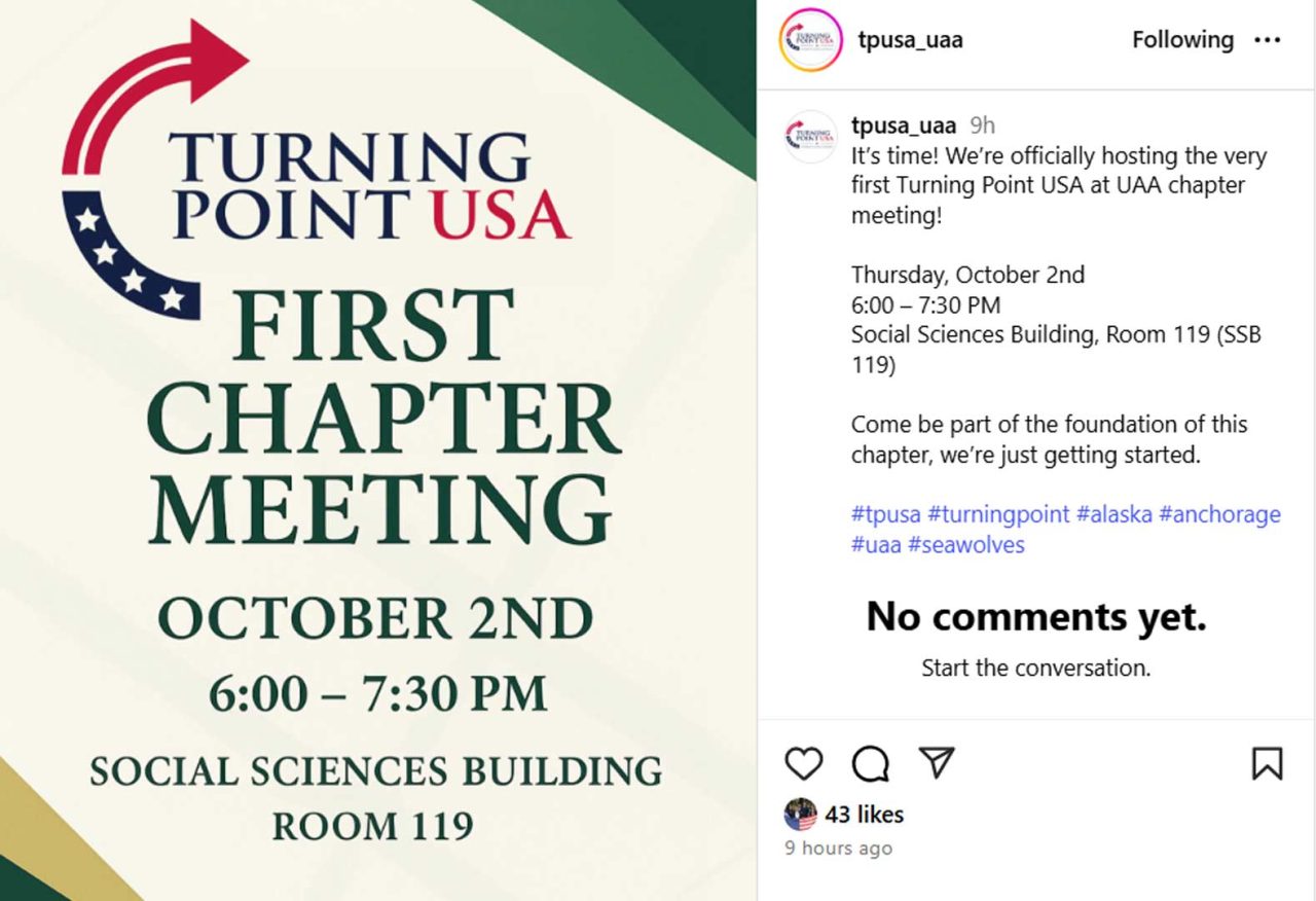 “It’s time! We’re officially hosting the very first Turning Point USA at UAA chapter meeting!” a notice on the group’s Instagram page states. “Come be part of the foundation of this chapter, we’re just getting started.”