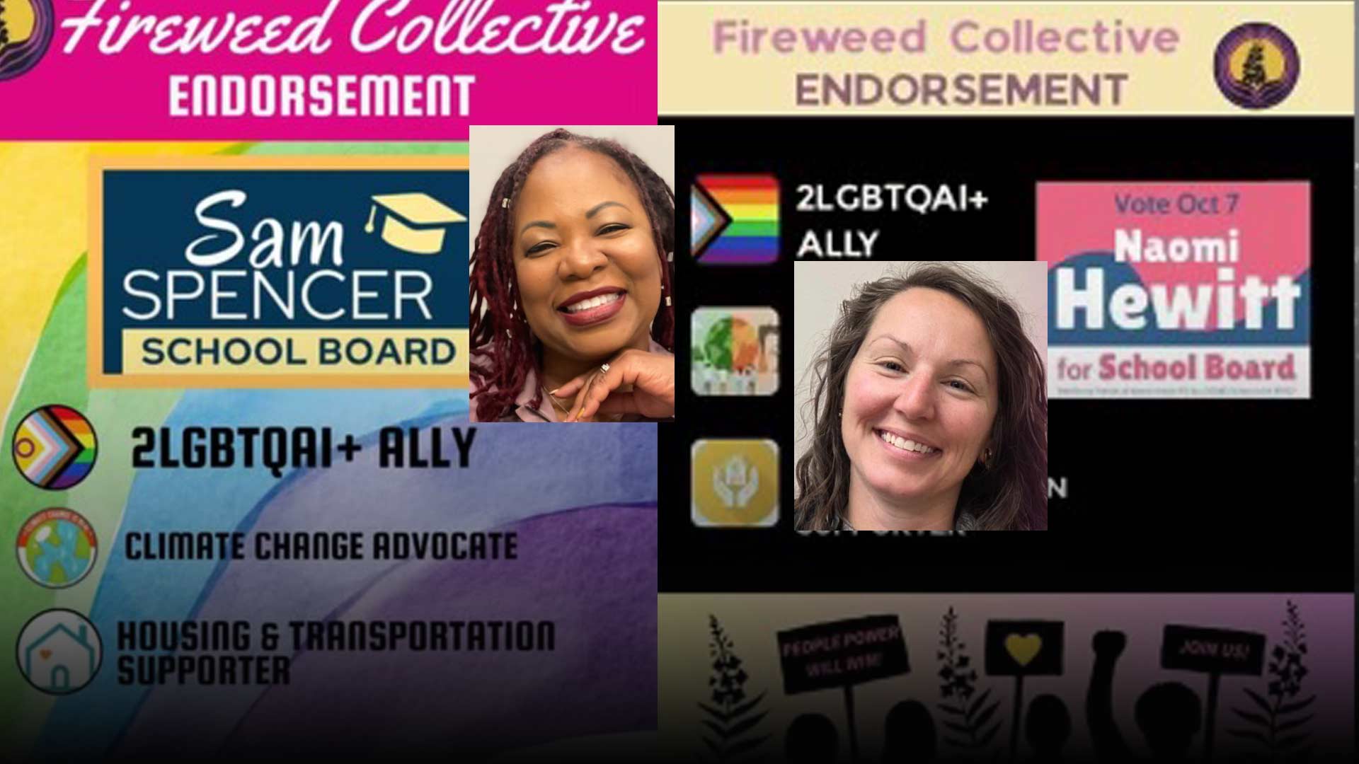 School Board candidates Naomi Hewitt and Chemetria (Sam) Spencer have the full backing of Fireweed Collective, which enthusiastically endorsed the duo for being “2LGBTQAI+” allies and “Climate Change” advocates. If elected, these women would further solidify the left’s supermajority on the school board, thereby making it easier to pass measures that promote the LGBTQ agenda in curriculum, activities and school policies.