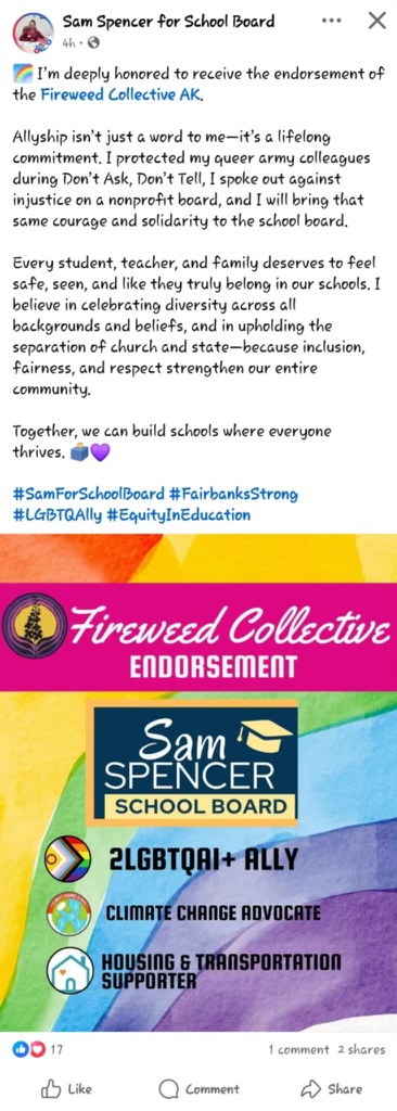 “Allyship isn’t just a word to me – it’s a lifelong commitment,” Spencer emphasized on Facebook after securing the Fireweed Collective endorsement. “I protected my queer army colleagues during ‘Don’t Ask, Don’t Tell. I spoke against injustice on a nonprofit board, and I will bring that same courage and solidarity to the school board.”
