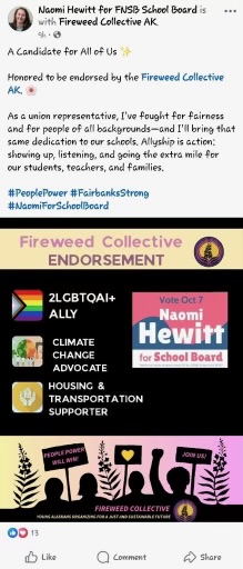 “As a union representative, I’ve fought for fairness and for people of all backgrounds – and I’ll bring that same dedication to our schools,” she posted to Facebook upon winning the Fireweed Collective endorsement.