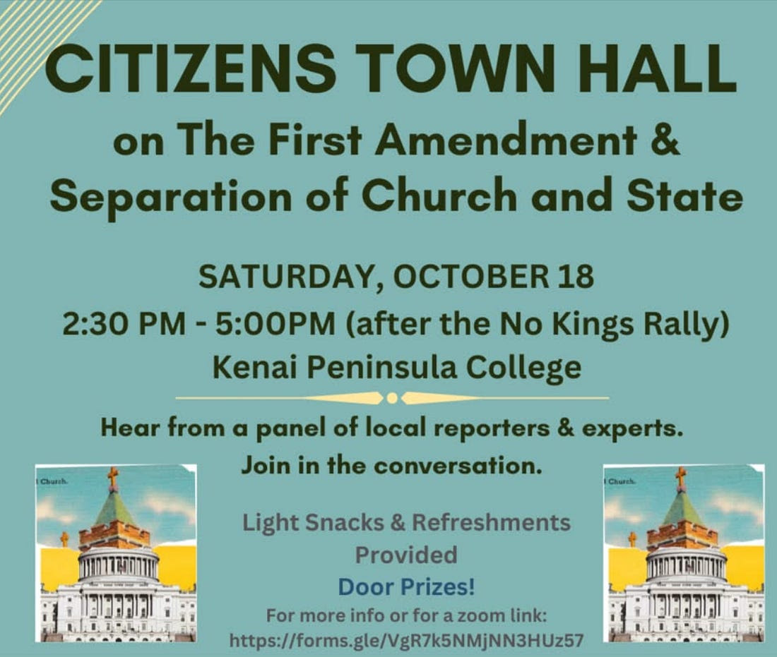 If you support President Trump and disagree with the organizers of the “No Kings” rally, I encourage you to drop by the local town hall meeting after the street protest. The lefties will be meeting at the Kenai Peninsula College, starting at 2:30 p.m. I will be attending to get a conservative voice in the room and hope to see more conservative Christians there as well. We also have a right to speak freely, and I intend to do so. It should be interesting. I hope to see you there.