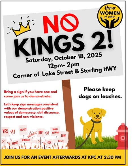 Local lefties will be protesting at their usual spot at the intersection of Lake Street and the Homer Bypass near McDonald’s. Afterwards, like their fellow travelers in Soldotna, they will be holding a town hall at the local KPC campus.
