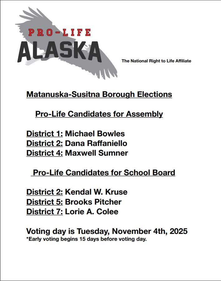 Pro-Life Alaska, the statewide branch of The National Right to Life, has issued candidate endorsements for the Mat-Su Borough Assembly and School Board races.