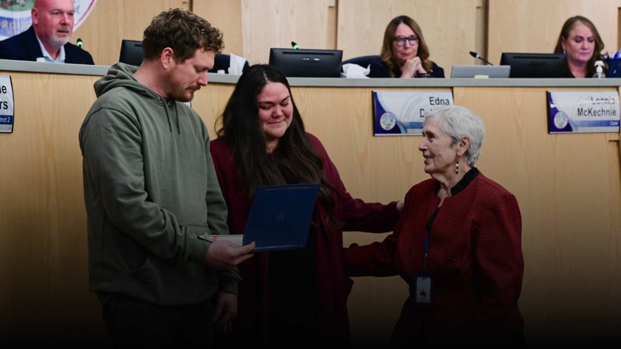 At the Oct. 21 Mat-Su Borough Assembly meeting, Mayor Edna DeVries presented two extraordinary members of the community, Maud and Russell “Eddy” Edmonds with a “Citizen Life Saver Award” for a quick response in a moment of crisis by providing lifesaving aid to a young girl in distress.