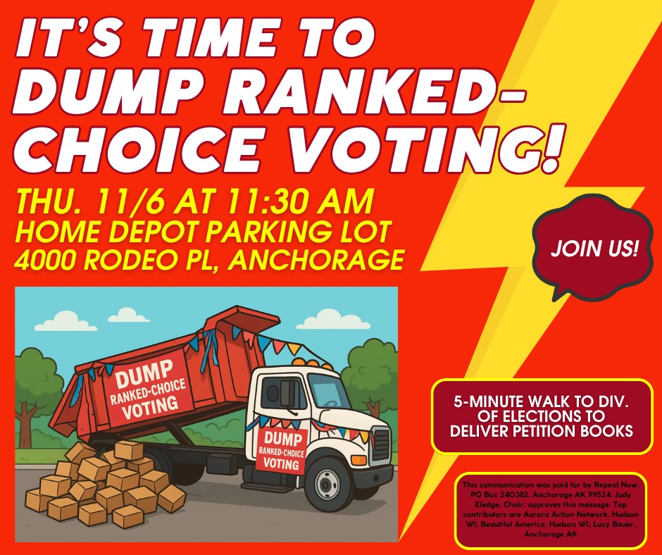 In a public display of solidarity, Alaskans who are ready to repeal the state’s controversial ranked-choice voting system are invited to join a caravan of fellow advocates for a five minute walk to deliver 48,000 signatures to the Division of Elections.
