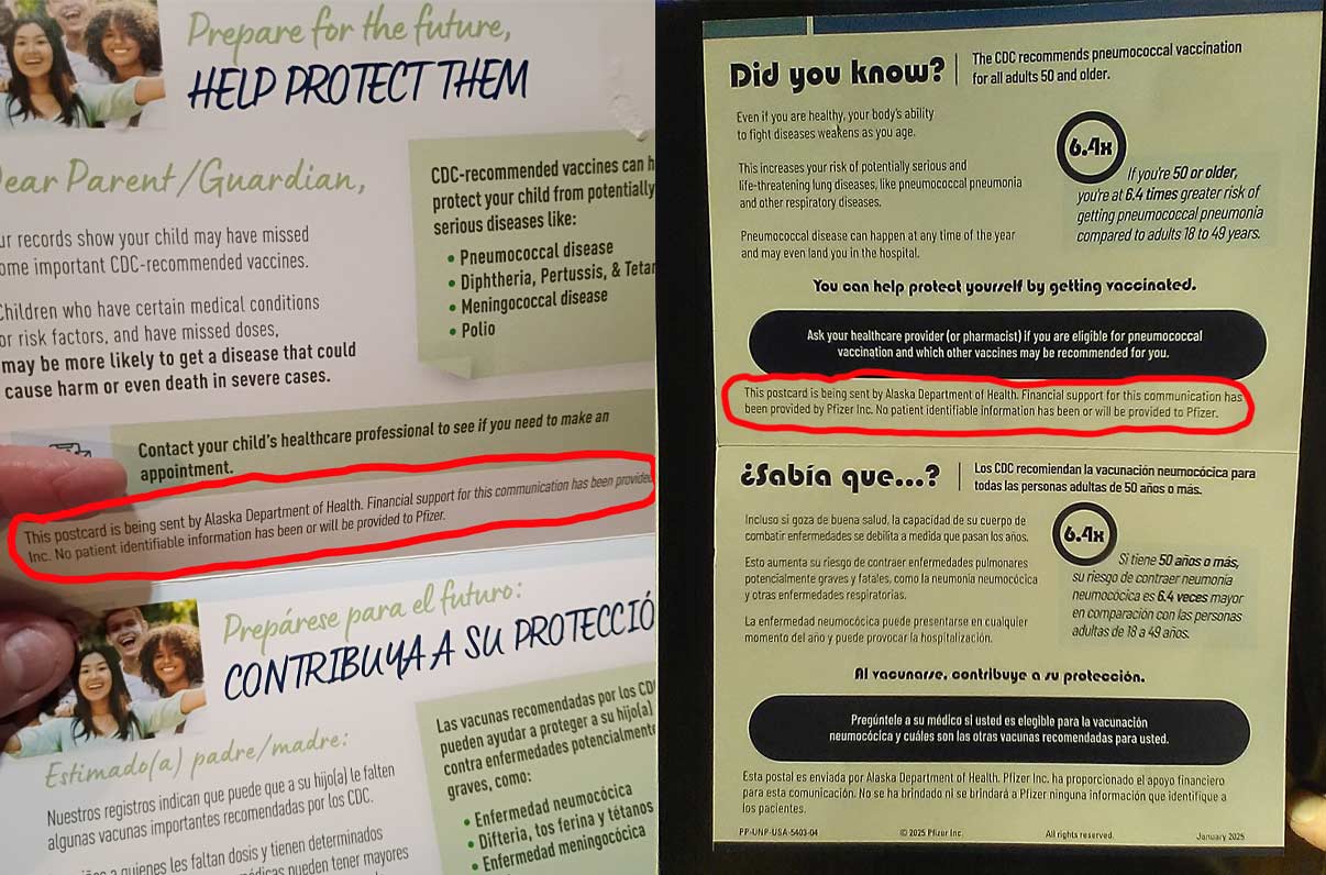 Various mailers are being sent by the Alaska Department of Health, but are funded by the international pharmaceutical giant, Pfizer, an organization currently mired in legal challenges regarding product safety for its birth control shot and the misrepresentation of its Covid jab’s effectiveness. It has also paid out billions in fines associated with marketing and fraud issues.
