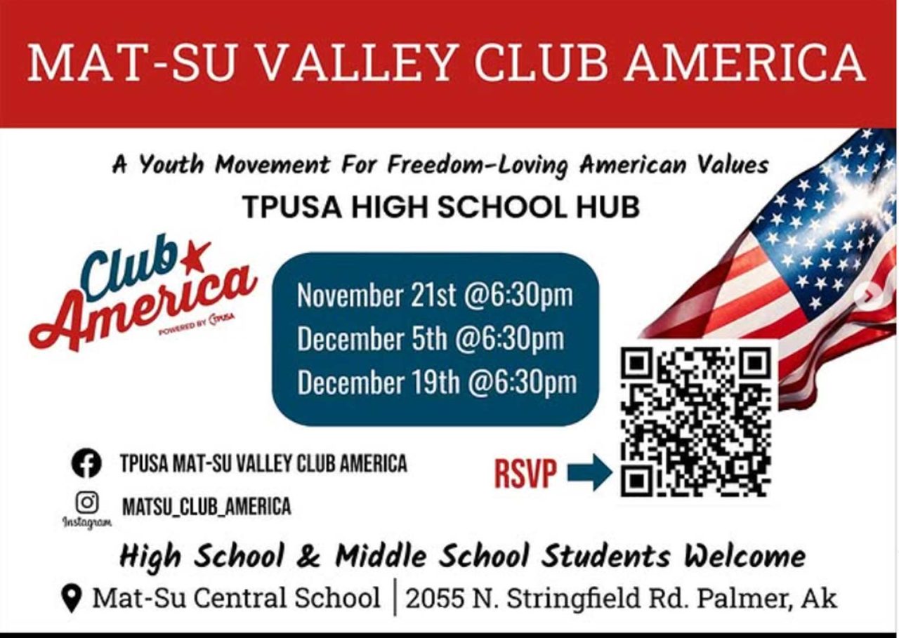 Club America, the teen version of Turning Point, will hold its first Mat-Su meeting at 6:30 p.m. in the Mat-Su Central School (2055 N. Stringfield Road). The meeting is open to high school and middle school students from across the Valley.