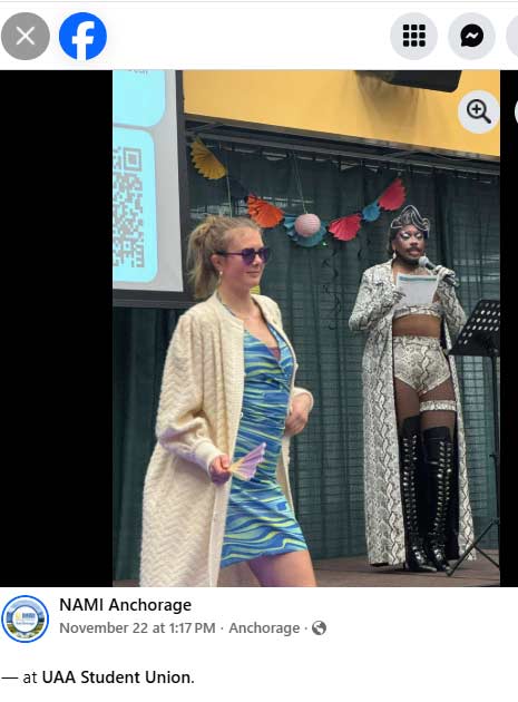 The Student Union of Alaska’s state-funded University of Alaska Anchorage campus was transformed into an all-ages gender-bending fashion show on Nov. 21, featuring a bearded man in revealing lingerie who pranced about as a woman in the main gathering space for campus events.