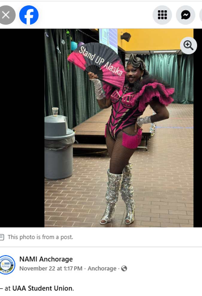 Drag queen performer “Athena Nuff,” a mainstay of Anchorage’s gay bar scene, was the master of ceremonies, wearing several revealing outfits and fake breasts as he directed the event while twisting and gyrating in front of students.