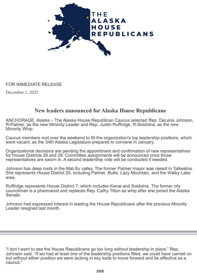 The statement added that all other organizational decisions and committee assignments would be announced after the new Mat-Su lawmakers are confirmed and sworn in. It also opened the door for another election on who should serve as Minority Leader and Whip.