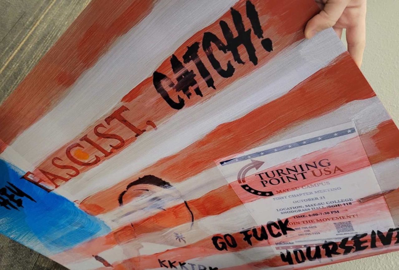 At the bottom of the poster, Kirk’s name was spelled with three K’s next to the phrase “go f*** yourself.” It also included a flyer used by the Mat-Su Turning Point club to announce its inaugural meeting on Oct. 21.