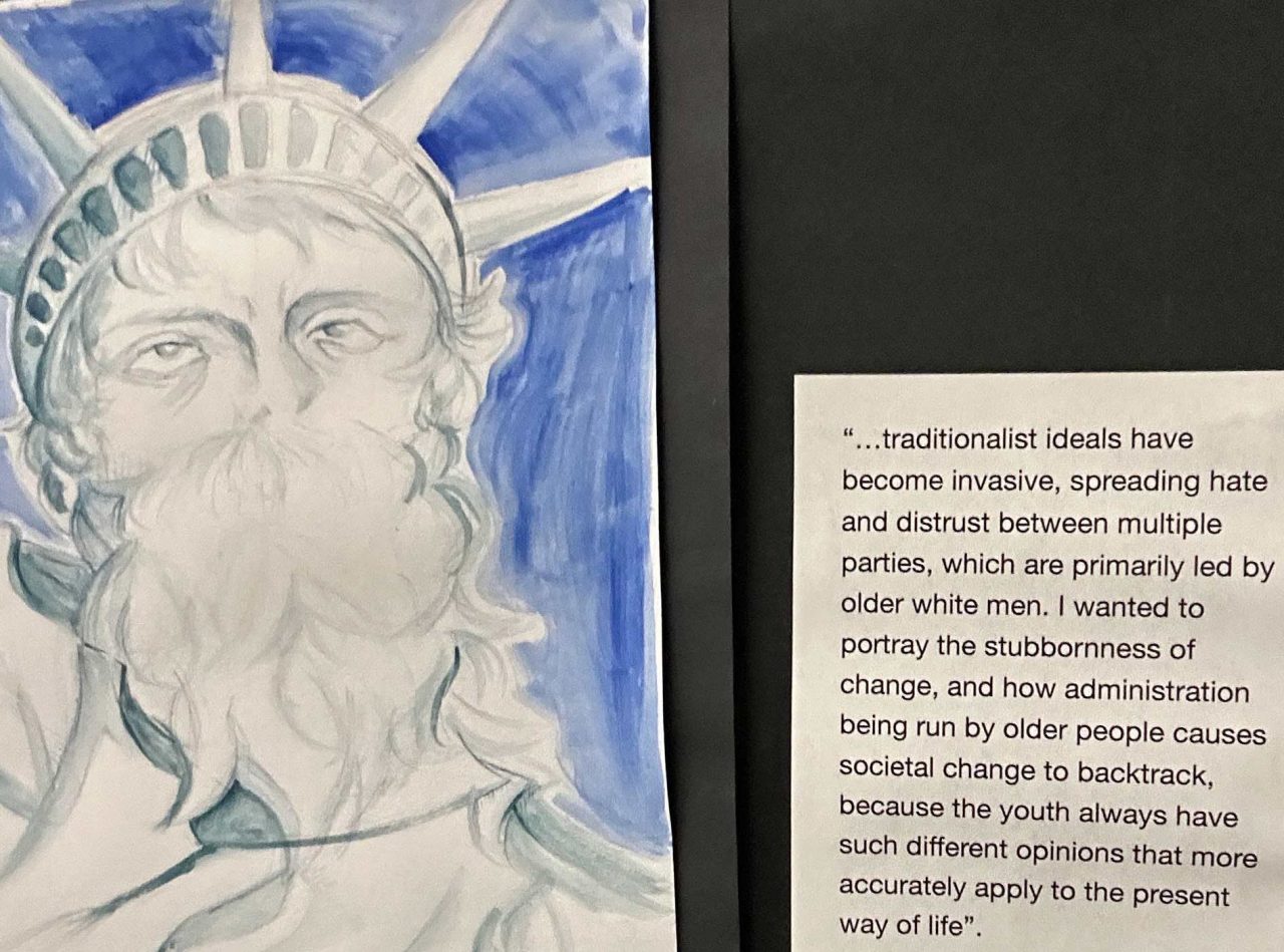 “Traditionalist ideals have become invasive, spreading hate and distrust between multiple parties, which are primarily led by older white men,” the student artist wrote. “I wanted to portray the stubbornness of change, and how administration being run by older people causes societal change to backtrack, because the youth always have such different opinions that more accurately apply to the present way of life.”