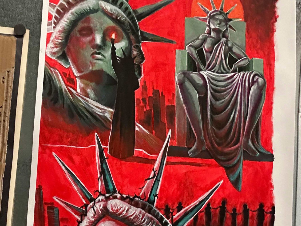 Other works show an ominous Statue of Liberty sitting upon a massive throne, looking out through a fiery eye and wearing a crown covered in what appears to be thorns or barbed wire.