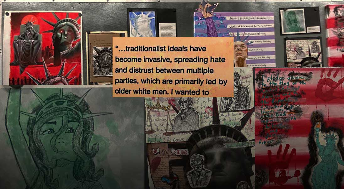 One piece portrayed the Statue of Liberty as an old white man and included a paragraph to explain the student’s intentions behind the art.