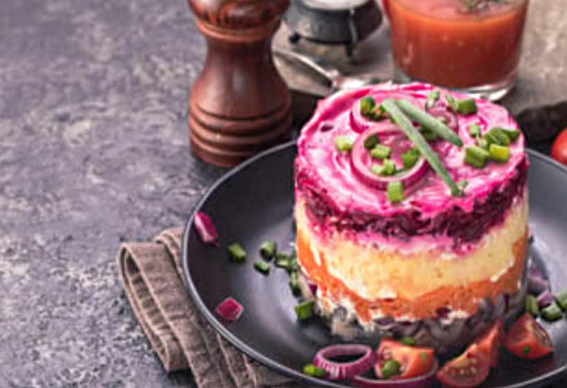 Selyodka pod shuboy (herring under a fur coat) includes layers of herring, potatoes, beets, and carrots, topped with mayonnaise.