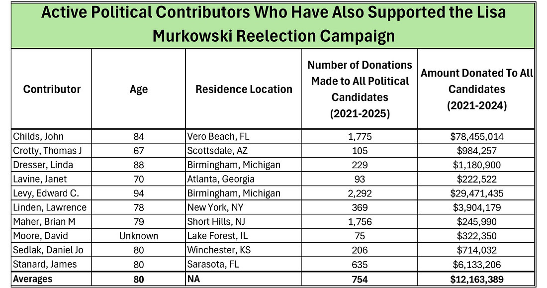 Whatever her next campaign is, you might think the large number is a sign that Alaskans really approve of the job our dear Lisa is doing, but you would be wrong. It isn’t Alaskans that are donating to her re-election. In 2025, only a paltry $225,893 came directly from Alaskans. The remaining $6.6 million came from doners living outside the state.