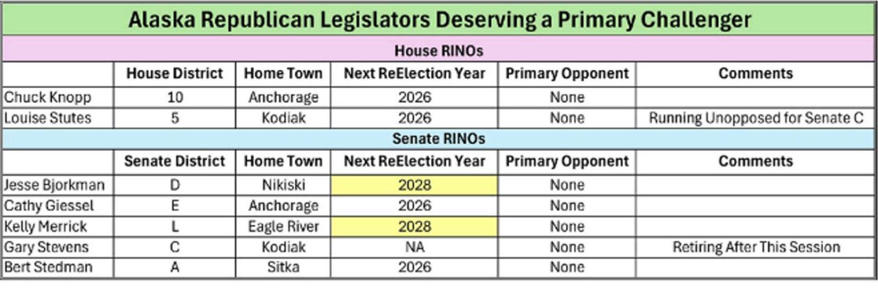 Fortunately, this is an election year, and Alaskans will have the opportunity to vote some of the bums out of office. Two of the RINOs are safe for now; Jesse Bjorkman (R-Nikiski), and Kelly Merrick (R-Eagle River) won’t face reelection until 2028. However, the remaining five must face voters this November.