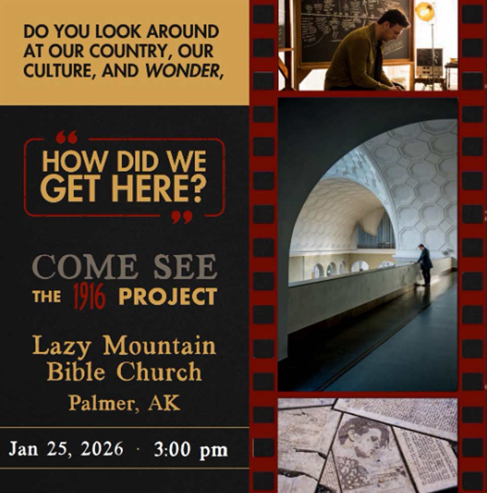 On Sunday, Jan. 25, Lazy Mountain Bible Church in Palmer is hosting a free showing of “The 1916 Project,” a groundbreaking documentary film that pulls back the curtain and exposes the hidden history of the secular moral revolution, while equipping the church to understand the times, resist evil and rebuild a culture of life.