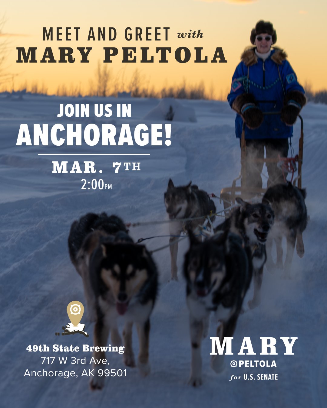 Following the ceremonial start of the Iditarod on March 7, Peltola plans to hold an Anchorage campaign stop at 49th State Brewing (717 W. 3rd Ave), starting at 2 p.m.