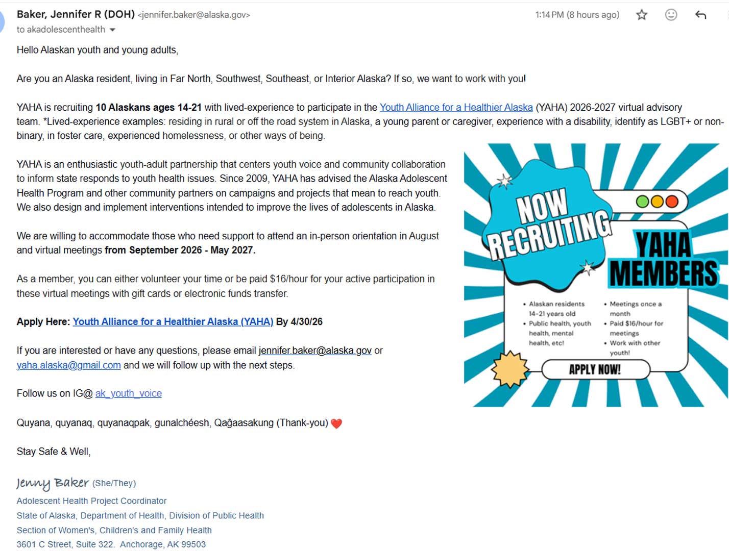 A March 26 email from Alaska’s Adolescent Health Project Coordinator Jenny Baker asks teens who personally identify as LGBTQ to apply for a spot on the Youth Alliance for a Healthier Alaska virtual advisory team.