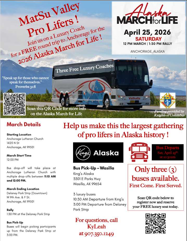 – Kings Alaska in Wasilla – thanks to a generous sponsorship from the Knights of Columbus, we’ll have 3 luxury Coach-style buses departing from Kings Alaska. These will fill up fast, so register now.