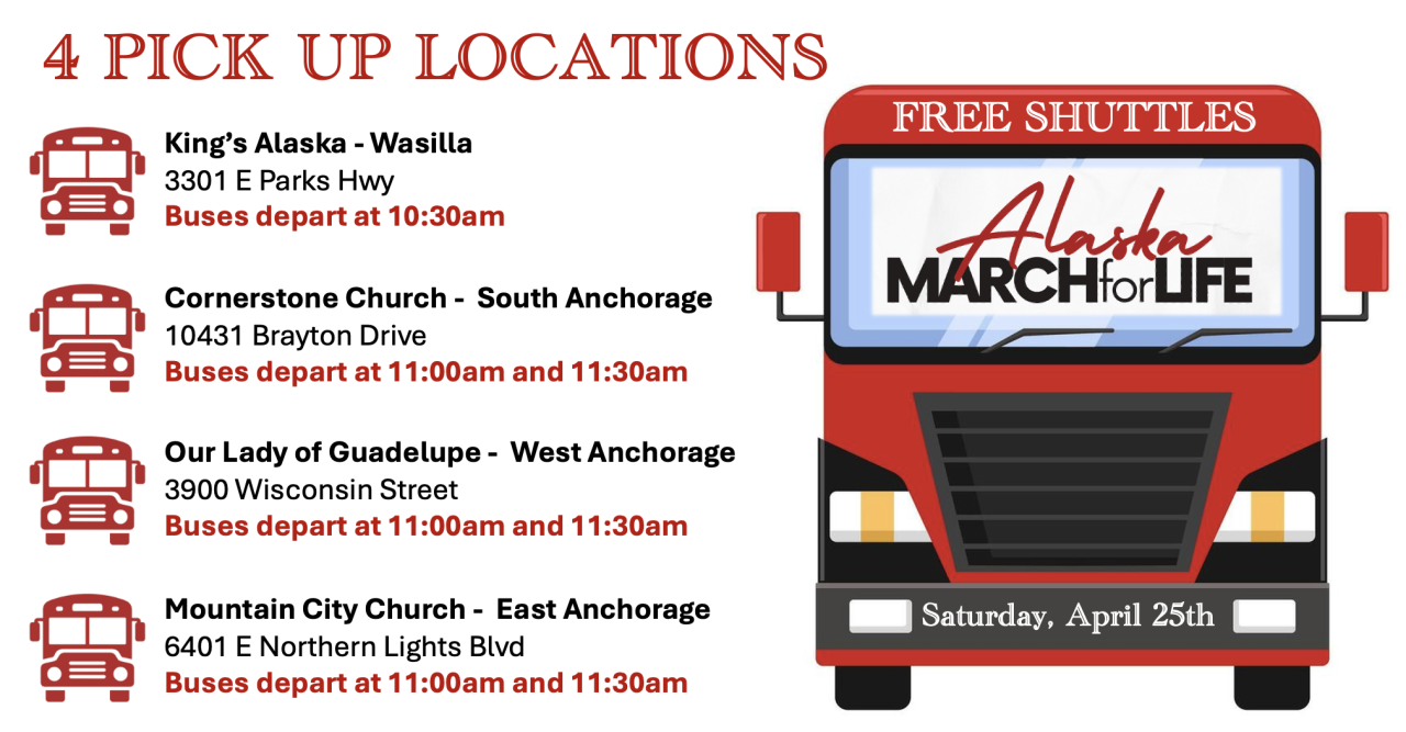 With the upcoming 2026 Alaska March for Life on Saturday, April 25th, expected to be the largest gathering of pro-life Alaskans in state history, we’re pleased to offer free round-trip shuttles from one of four (4) locations. Even if you’re already in Anchorage, we need as many people as possible to register for the free round-trip shuttles to ease limited parking at our starting point downtown at Anchorage Lutheran Church.