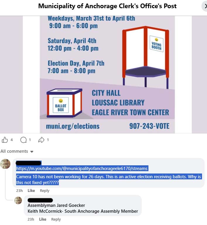 A March 31 public comment on the official Municipality of Anchorage Clerk’s Office Facebook page expresses concern about “camera 10” being down during an active election when ballots are being received and processed. The commenter asked why it hadn’t been fixed, but there were no replies, statements, or updates from officials in those threads or elsewhere.