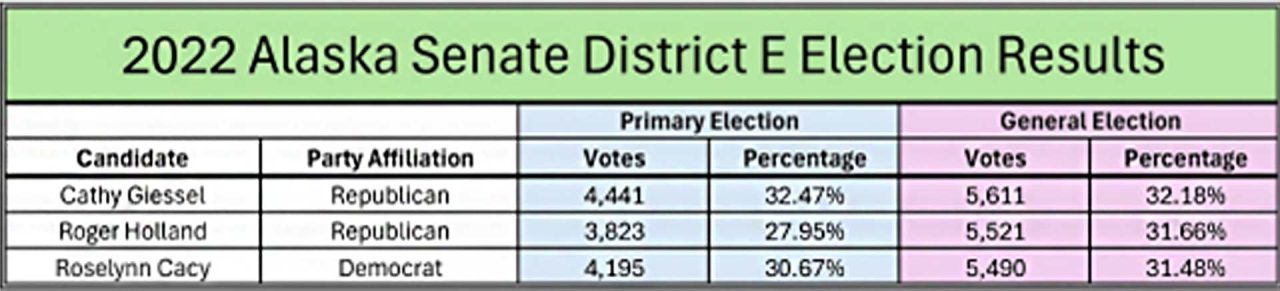 Just two years later, because of redistricting, Giessel was able to run for her old seat again, but this time she had RCV on her side. You may remember the infamous Mary Peltola victory in that year’s election, which defined everything Alaskans dislike about RCV. Mostly forgotten now, Giessel also had a similar controversial RCV victory in that election.